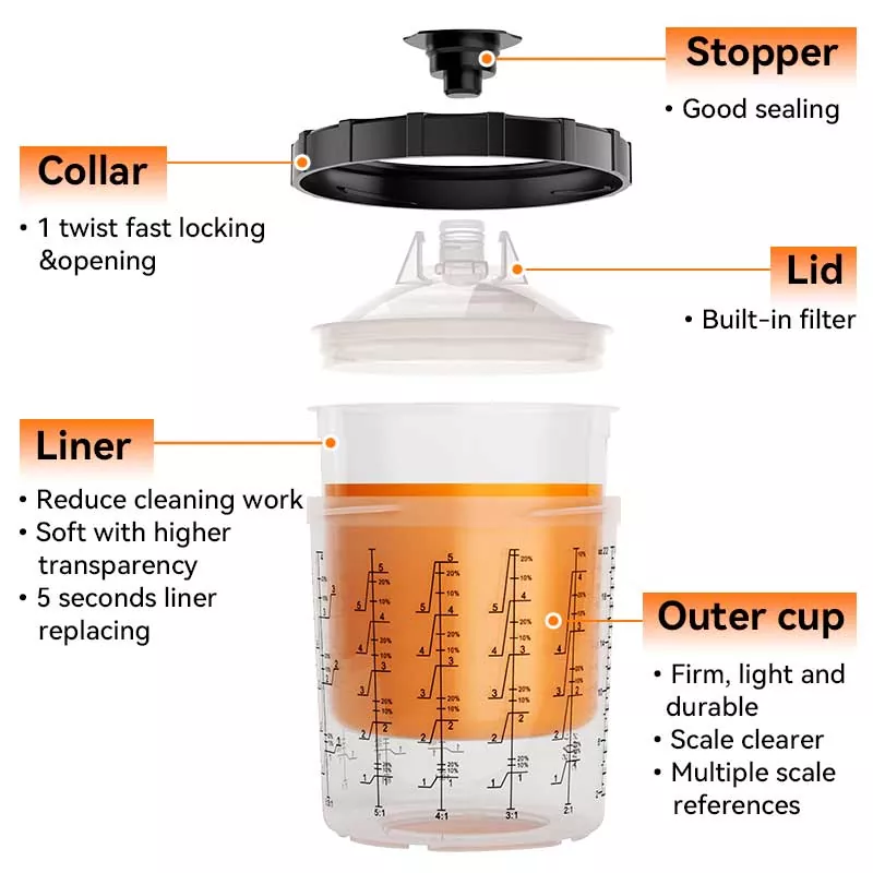 Systém jednorázových nádobek na barvu kombinuje funkce míchání, filtrování, stříkání a skladování v jedné jednotce. To nejen zjednodušuje přípravu před nátěrem, ale také šetří náklady na míchání kelímků a papírových nálevek, což z nich dělá perfektní volbu pro úsporu času na přípravu a zlepšení účinnosti stříkání.