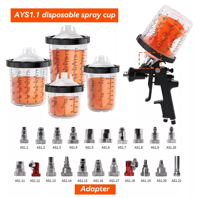 Jednorázový sprej AYS1.1 je kompatibilní s adaptérem řady PPS1.0. S adaptérem se dá perfektně přizpůsobit jakékoli značce stříkací pistole a dá se použít v jakékoli poloze bez rizika odkapávání barvy.