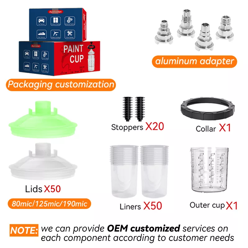 650ML Speedy Paint System 2.0 je nový typ systému jednorázových nádobek ve spreji. Jeden karton obsahuje [1 vnější kelímek + 1 límec + 50 vložek + 50 víček + 20 zátek], podporuje více barev barvy v jedné aplikaci. Pro různé velikosti částic barvy jsou k dispozici filtry s velikostí 80, 125 a 190 mikrometrů, které umožňují vybrat si vhodný filtr. Jednorázový systém nádobek na barvu ve spreji může fungovat také jako jednotka na míchání a skladování barvy, takže již není potřeba používat papírové nálevky a nádobky na míchání, čímž lze dosáhnout čtyř funkcí v jednom: filtrování, míchání, stříkání a skladování barvy. To je důvod, proč milovníci malování tento produkt tak milují.