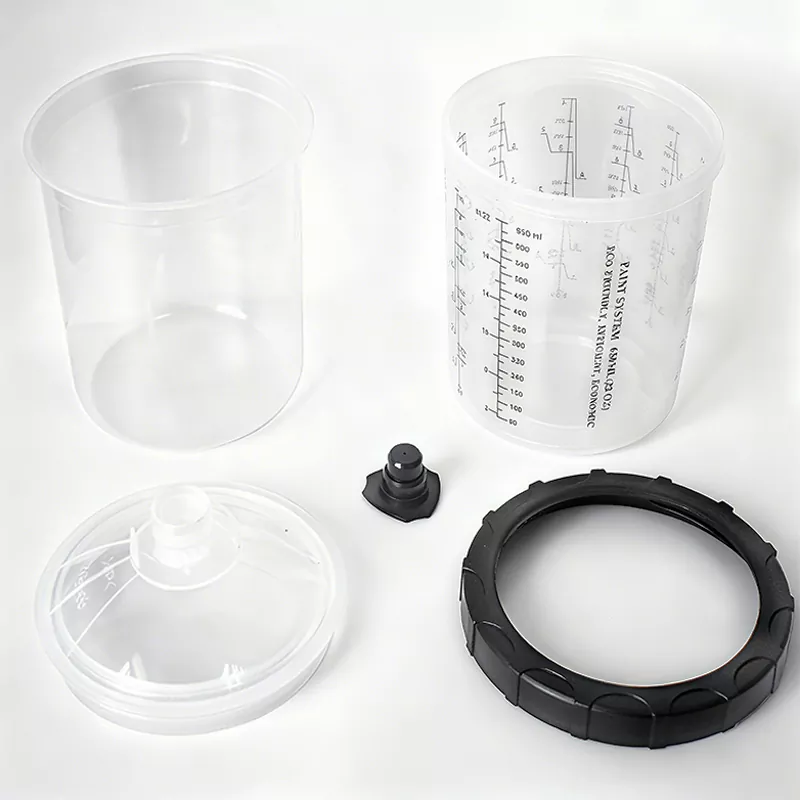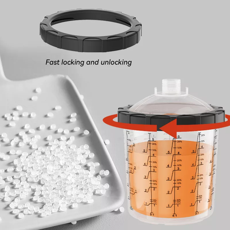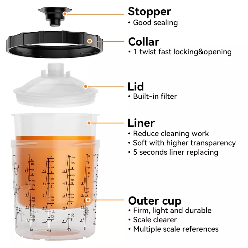 850ML Speedy Paint System 2.0 se skládá hlavně z 5 částí: zátka, víko, límec, vložka a vnější miska. Mezi nimi, kromě toho, že vnitřní je vyrobena z PE, zbytek je převážně vyroben z PP. Vložka je velmi měkká a lze ji snadno vyjmout a vyměnit; ostatní díly jsou pevné a velmi odolné. Vznik jednorázového systému nádobek na barvu může dokonale nahradit tradiční samospádový, což nejen snižuje náklady na mytí, ale také zvyšuje míru využití barvy, a tím šetří náklady. A co víc, protože není potřeba čistit kelímkový systém, lakýrníci se vyhnou přímému kontaktu s jedovatou barvou, aby bylo zajištěno jejich zdraví. Vývoj a výroba takového ekologického a efektivního produktu je přesně to, co Aspaint dělá.