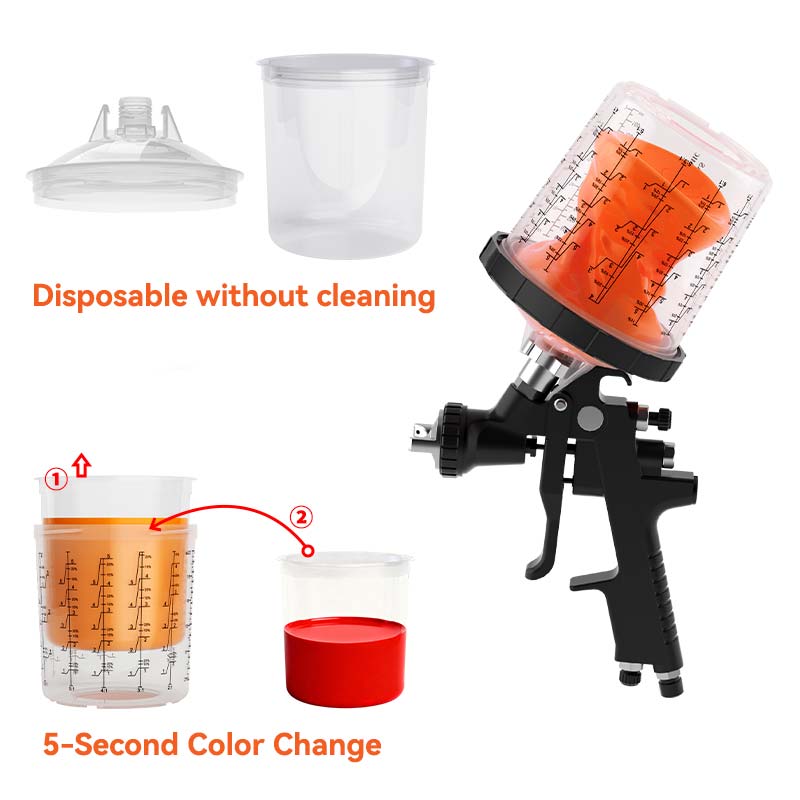 Thejednorázový kelímek na stříkací pistoli po použití nevyžaduje čištění; jednoduše vyhoďte vnitřní nádobku, abyste rychle změnili barvy, zkrátili interval výměny barvy z 20 minut na 5 sekund, čímž se efektivně zdvojnásobí denní produkce. Víko je vybaveno vestavěným jemným filtrem, který účinně filtruje nečistoty a zajišťuje rovnoměrný a hladký sprej, což má za následek kvalitnější povrchovou úpravu.