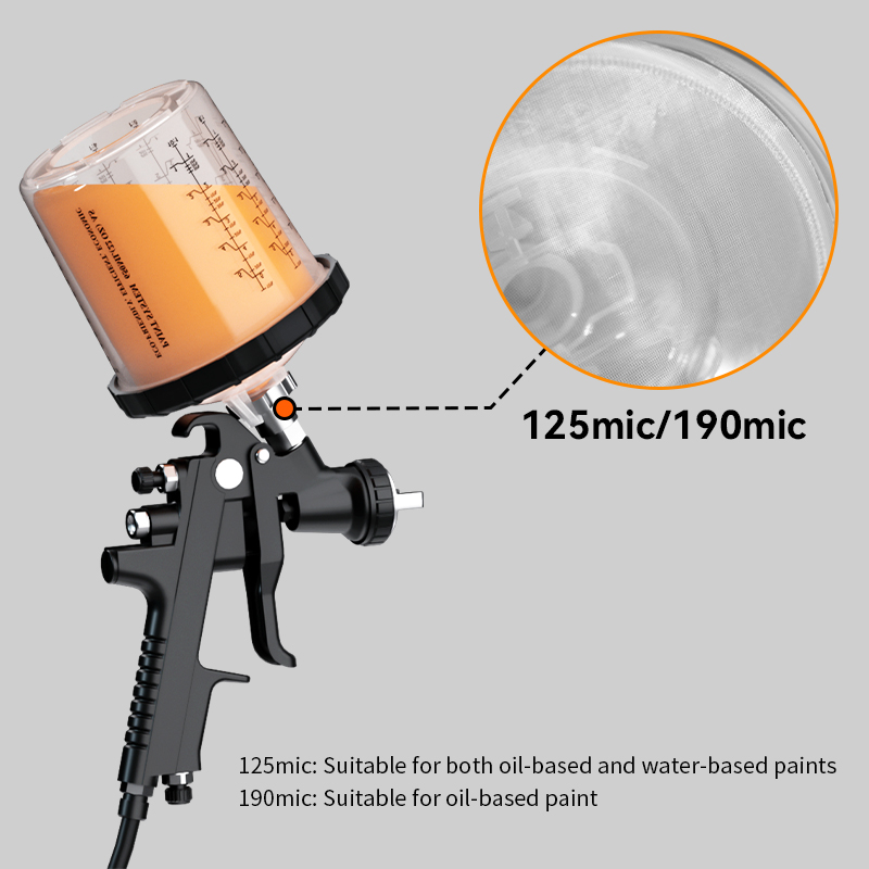 • Vestavěné integrované filtry pro vynikající povrchovou úpravu laku: Jednorázové víčko spreje obsahuje vestavěné 190μ (olejové barvy) a 125μ (vodní barvy) filtry, které účinně filtrují nečistoty během stříkání a zvyšují lesk laku o 20 %.