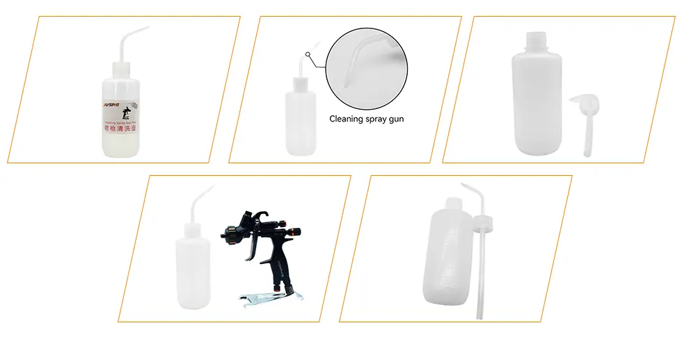 Ayspat Spray Gun pro mytí pistolí je efektivní nástroj pro čištění stříkací pistole s vynikajícím čisticím efektem. Může rychle opláchnout barvu zbývající ve stříkací pistoli, která může lépe chránit přesné části uvnitř stříkací pistole. Hrnec pro mytí stříkací pistole se snadno ovládá a intenzitu a směr toku kapaliny lze přesně ovládat stisknutím těla láhve. Po malířské operaci použijte mycí nádobu pro mytí pistole k naložení rozpouštědla k propláchnutí skvrn komplexních potrubí uvnitř stříkací pistole, které mohou udržovat stříkací pistoli a výrazně prodloužit svou životnost. Láhev pro praní zbraní je vyrobena z měkkého a lehkého materiálu PP, který je odolný vůči korozi rozpouštědly, jako je aceton a toluen. Je to ideální řešení pro vaši údržbu stříkací zbraně.
